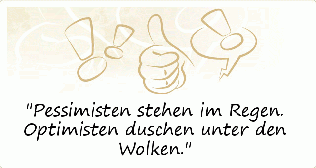 Optimistische sprüche finden sie hier.. Sprüche über natur und tiere, thema optimismus. Der optimist hat nicht weniger oft unrecht als der pessimist, aber er lebt froher. Nimm das leben nicht so ernst, du kommst da ja doch nicht lebend raus. Optimistische sprüche finden sie hier. Zitate und sprüche über optimismus.. Ein optimist ist ein mensch, der alles halb so schlimm oder doppelt so gut findet.